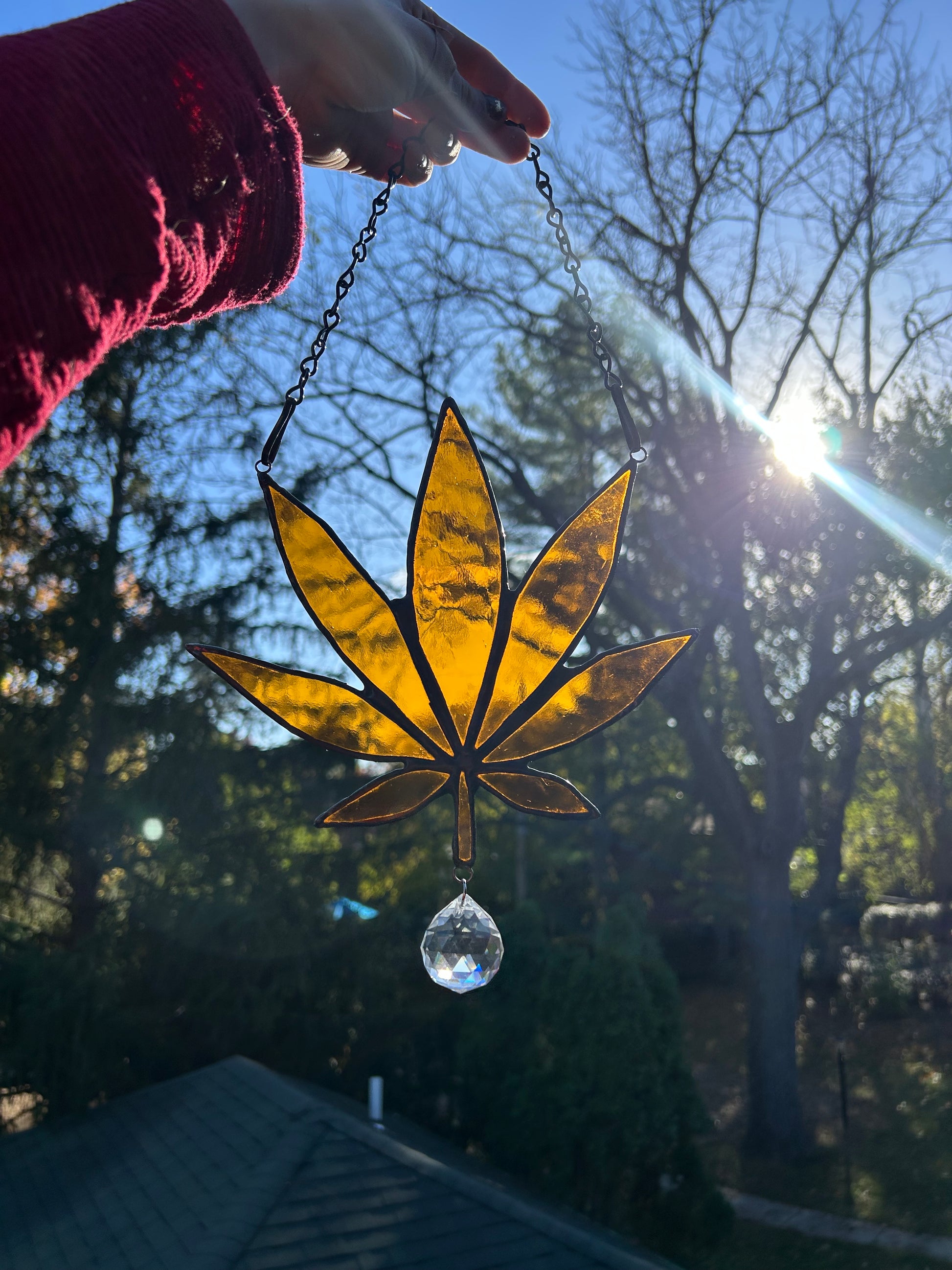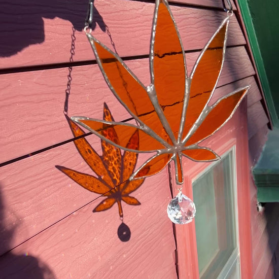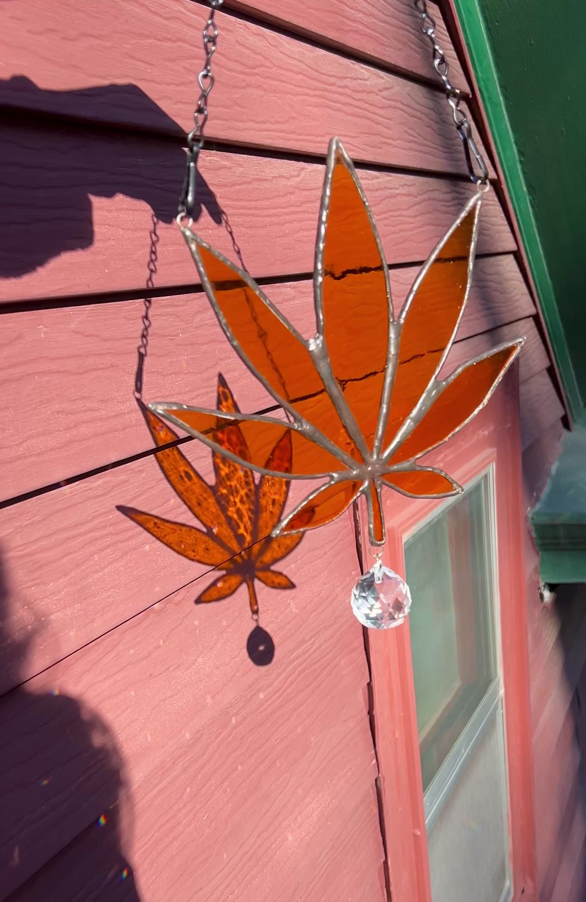 Large amber 🍃 leaf suncatcher. This glass I got in Colorado is so gorgeous!! The large prism bead I used here refracts tons of rainbows when it gets direct sunlight– swipe to the last slide for a video.